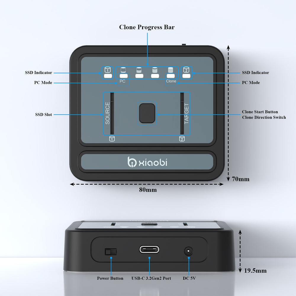 Xiaobi NVMe Cloner supports 20Gbps offline cloning. Insert two SSDs, connect the power adapter (no computer), then long-press the clone button for 5 seconds until the first indicator flashes blue.