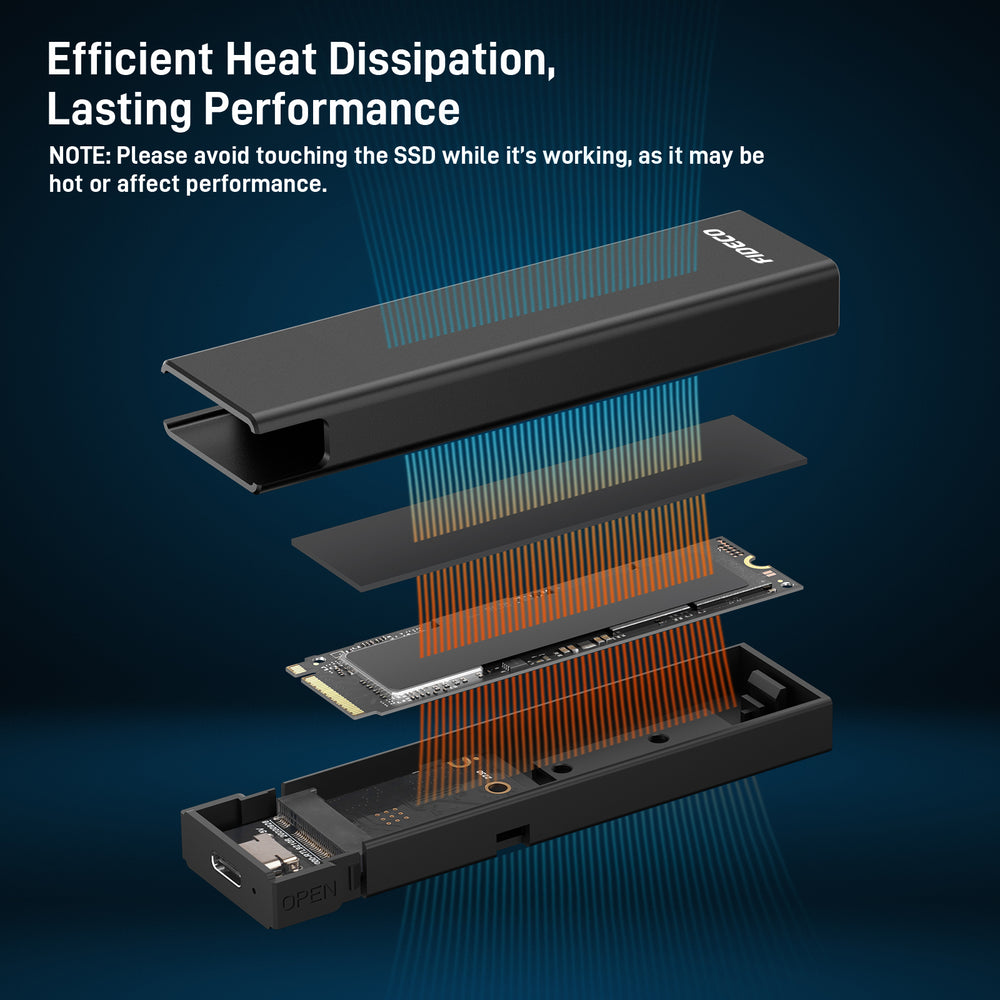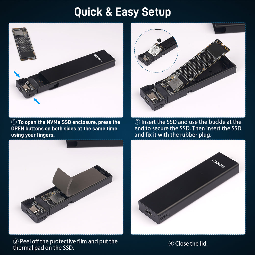 NOTE: Remove the transparent film from the USB-C NVMe enclosure. To open the NVME SSD Enclosure, press the OPEN buttons on both sides at the same time using your fingers.